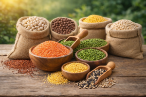 Premium Indian pulses including chickpeas, lentils, toor dal, moong dal, and urad dal. Hygienically processed and graded for export, with multiple varieties and packaging options for bulk, retail, and private labeling.